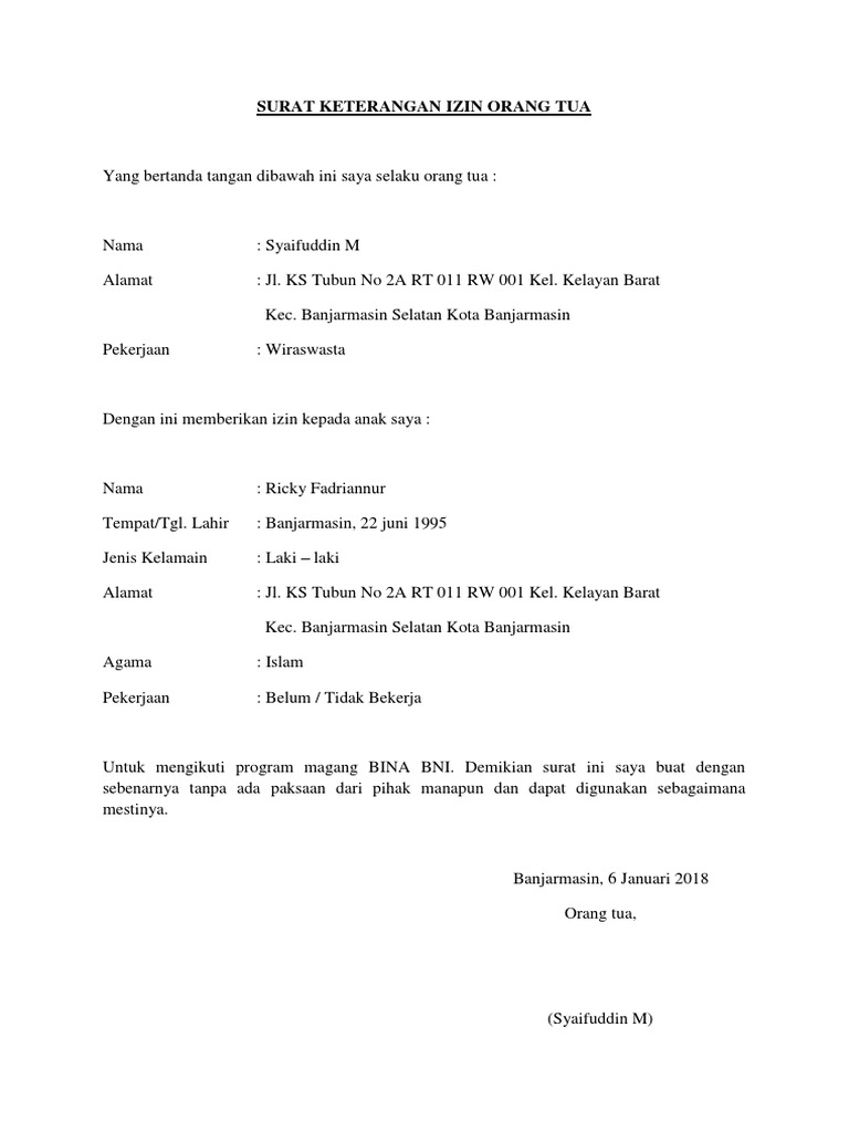 Berikut ini adalah beberapa contoh surat izin orang tua terlengkap serta terbaru, untuk informasi lebih lengkapnya bisa kalian baca artikel berikut ini. Berikut ini merupakan contoh dari surat izin untuk bekerja di pabrik sepatu. 11 contoh surat izin tidak masuk sekolah dan cuti kerja. Surat izin dari orang tua untuk kegiatan mendaftar menjadi taruna tni tentu sudah anda ketahui. Contoh surat pernyataan orang tua untuk bekerja di luar negeri. Tidak hanya itu bagi yang sedang mencari surat izin usaha, keramaian, dan mengadakan acara juga memerlukan. Jadi untuk kalian orang tua yang mau anaknya sukses. Penulis mencantumkan diri sebagai orang tua murid atau. Yang bertanda tangan di bawah ini saya selaku orang tua : Acara ospek mengapa harus izin orang tua kompasianacom. Tanda tangan jangan lupa untuk mencantumkan nama terang dan membubuhkan tanda. Penjelasan lengkap seputar contoh surat izin orang tua yang baik dan benar untuk berbagai demikian surat izin ini saya buat dengan sesungguhnya agar dipergunakan sebagaimana mestinya. Isi berisi inti dari surat izin orang tua, baik pernyataan persetujuan maupun penolakan terhadap kegiatan yang dimaksud.